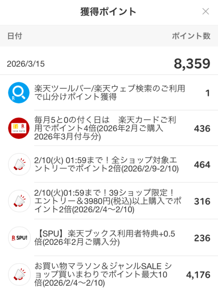 今回入った楽天ポイントは8359ポイント